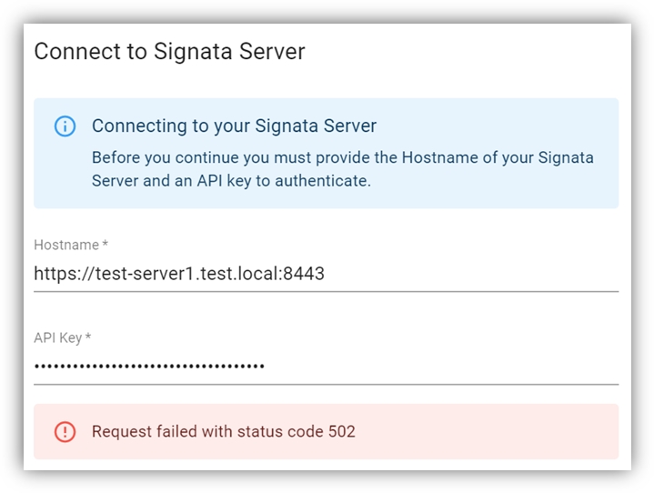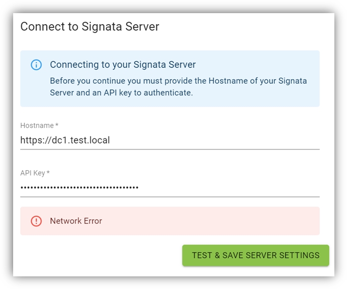 Ensure that the Signata Server is up and can be connected to from the client machine. Ensure the port and protocol (https:// or http://) is correct. Ensure that the certificate for https:// is correct.